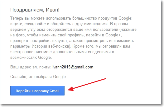 регистрацией почты и предложит перейти в свой почтовый ящик. Нажмите «Перейти к